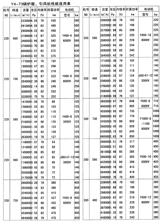 Y4-73锅炉鼓、引风机性能选用表